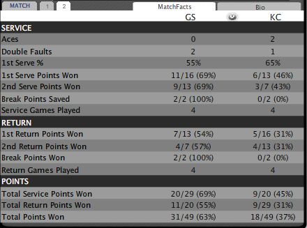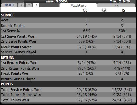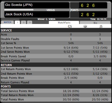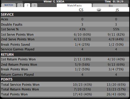 ダブルフォルトでブレイクできたと思ったら今度はダブルフォルトでチャンスが来たと思ったらエースで凌がれたり、ソックがどうも安定しないといった印象。