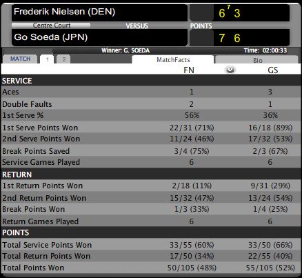 とはいえ、ニールセンも去年の秋以降調子を上げているようで、去年最終戦をチャレンジャー準優勝で終え、この全豪オープン予選では117位の選手に圧勝して予選決勝まで駒を進めています。